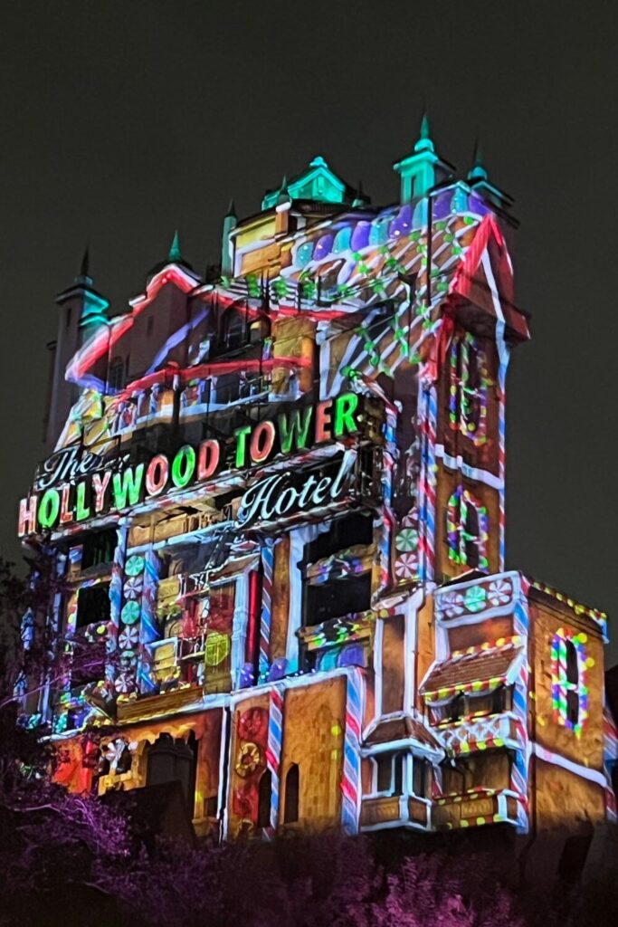 Next, over at Hollywood Studios is Sunset Seasons Greetings, a nighttime projection show on the Hollywood Tower Hotel featuring holiday tunes and snoap, aka fake snow.